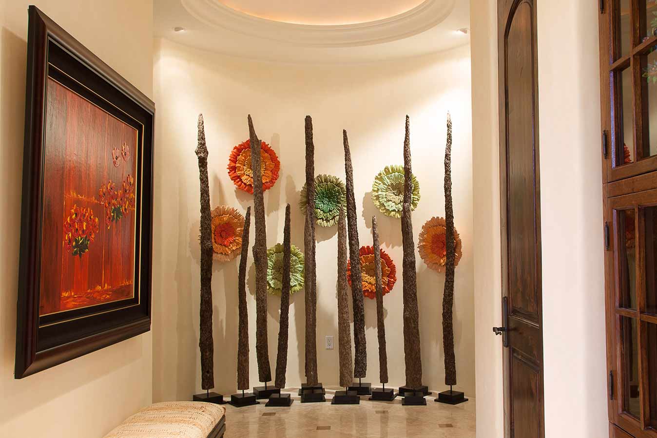 Living Area: A dynamic combination of indoor and outdoor living space, the indoor living area includes floor-to-ceiling glass doors that recede into the walls and open to the outdoors. Antiques from Mexico and original art add to the ambiance. Part of the villa’s dramatic entrance, this living area has caused many a jaw to drop.
