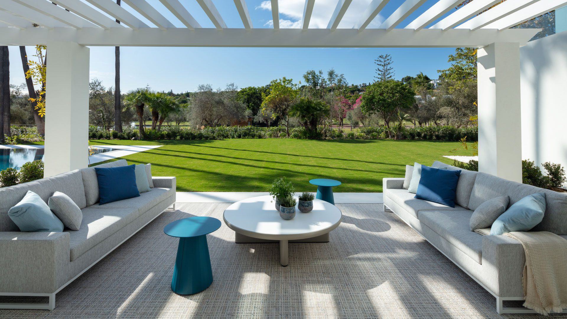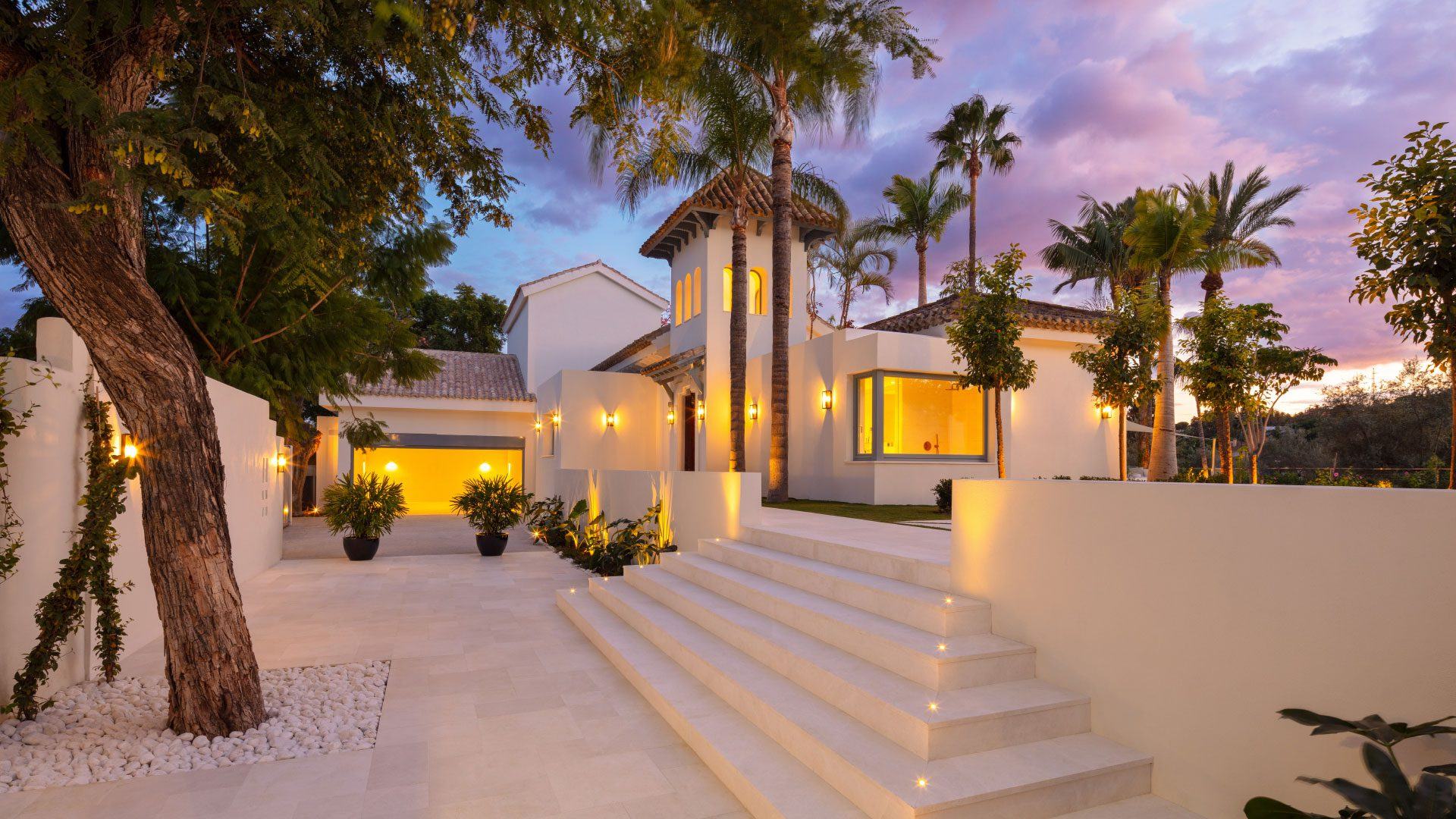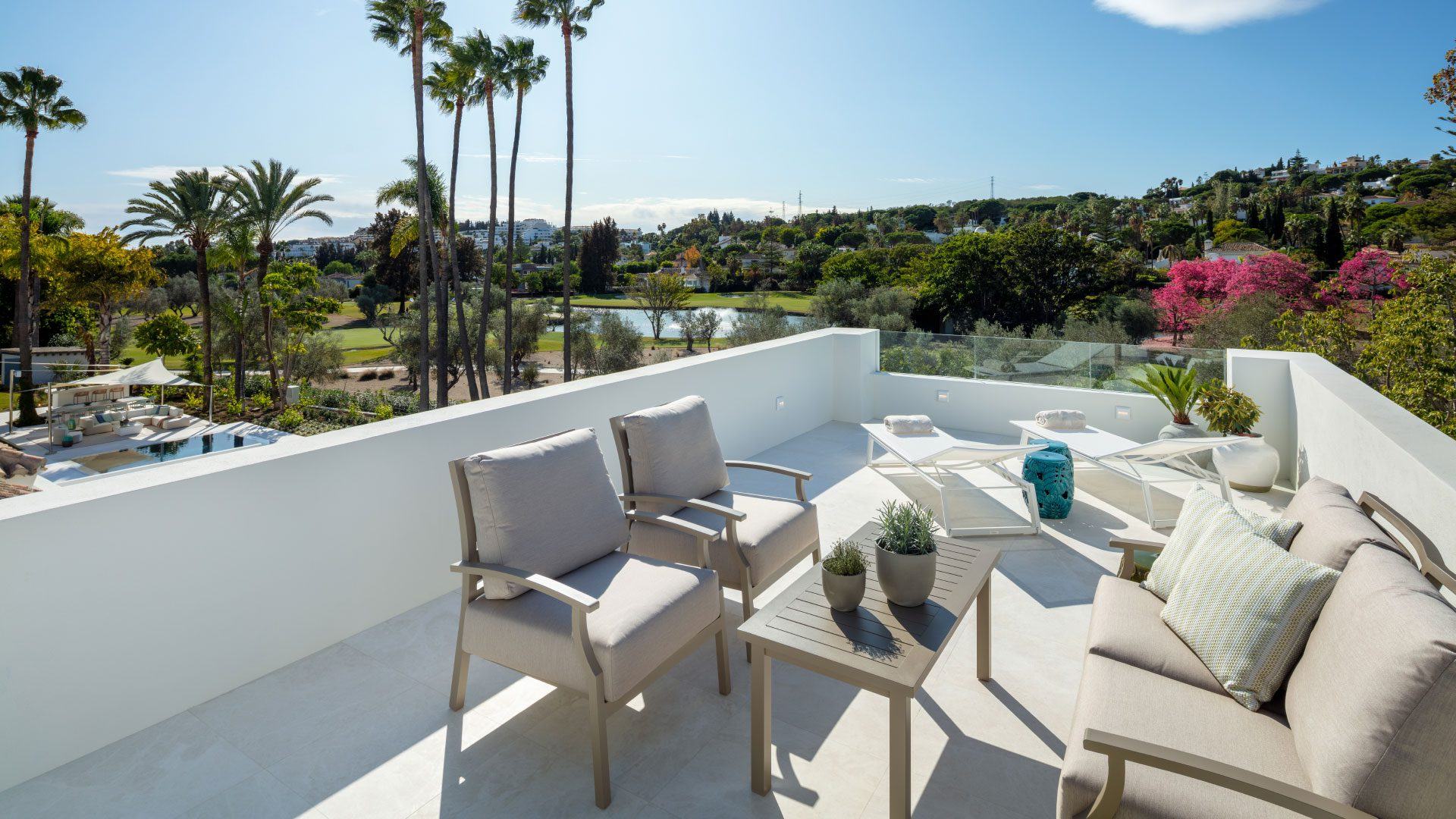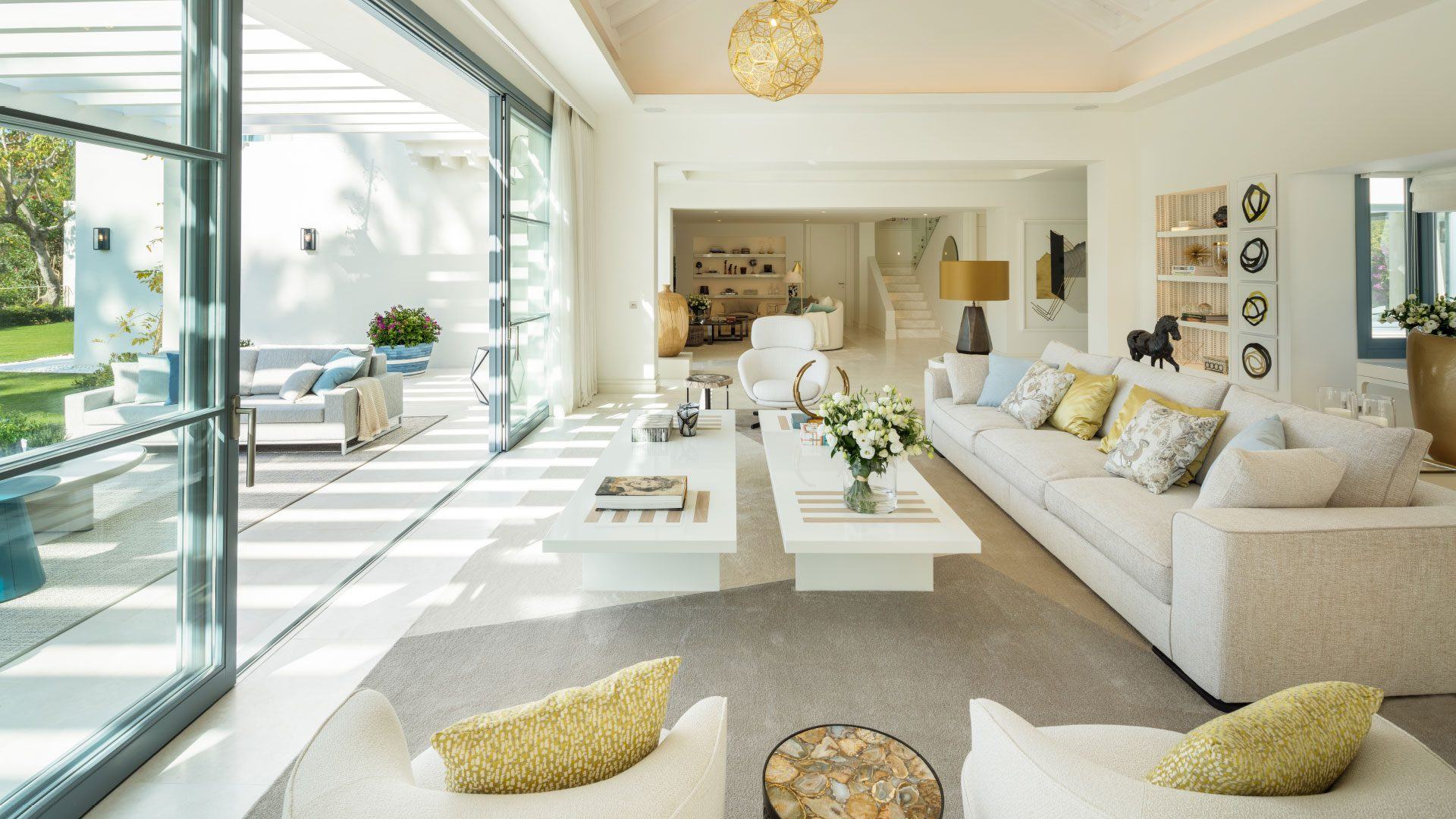 Inside, the property showcases sophisticated interiors designed by Pedro Peña, with soaring ceilings, elegant living spaces, and seamless indoor-outdoor flow. The estate includes a main house and a separate guest house, together providing luxurious accommodation for up to 14 guests. Highlights include a fully equipped gym and yoga studio, multiple kitchens including a chef’s kitchen for private catering, expansive entertaining areas, and serene bedroom suites with spa-style bathrooms. Located in a gated community with 24/7 security just minutes from Puerto Banús, beaches, and world-class golf, the villa delivers the perfect blend of privacy, glamour, and resort-style living.