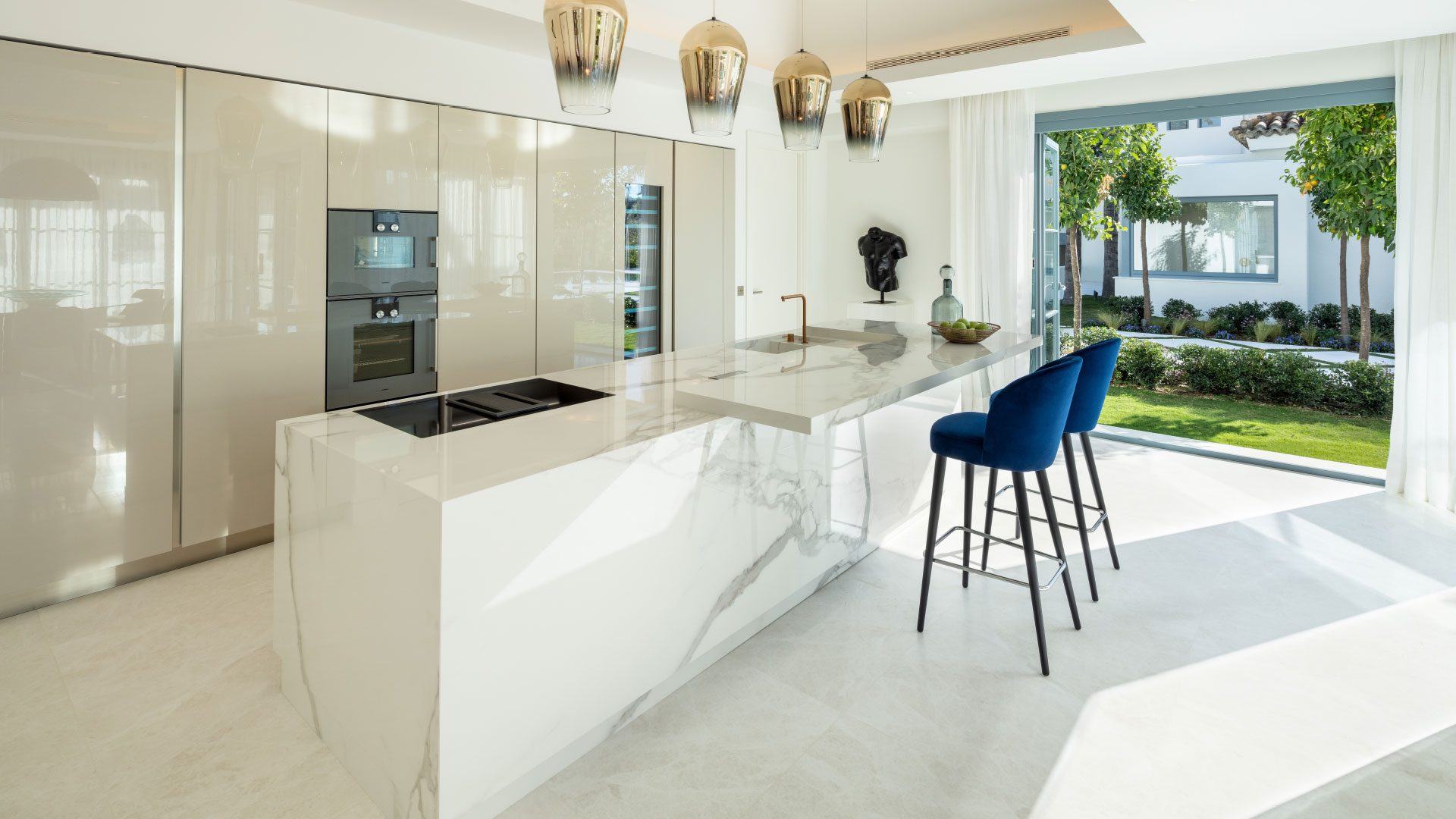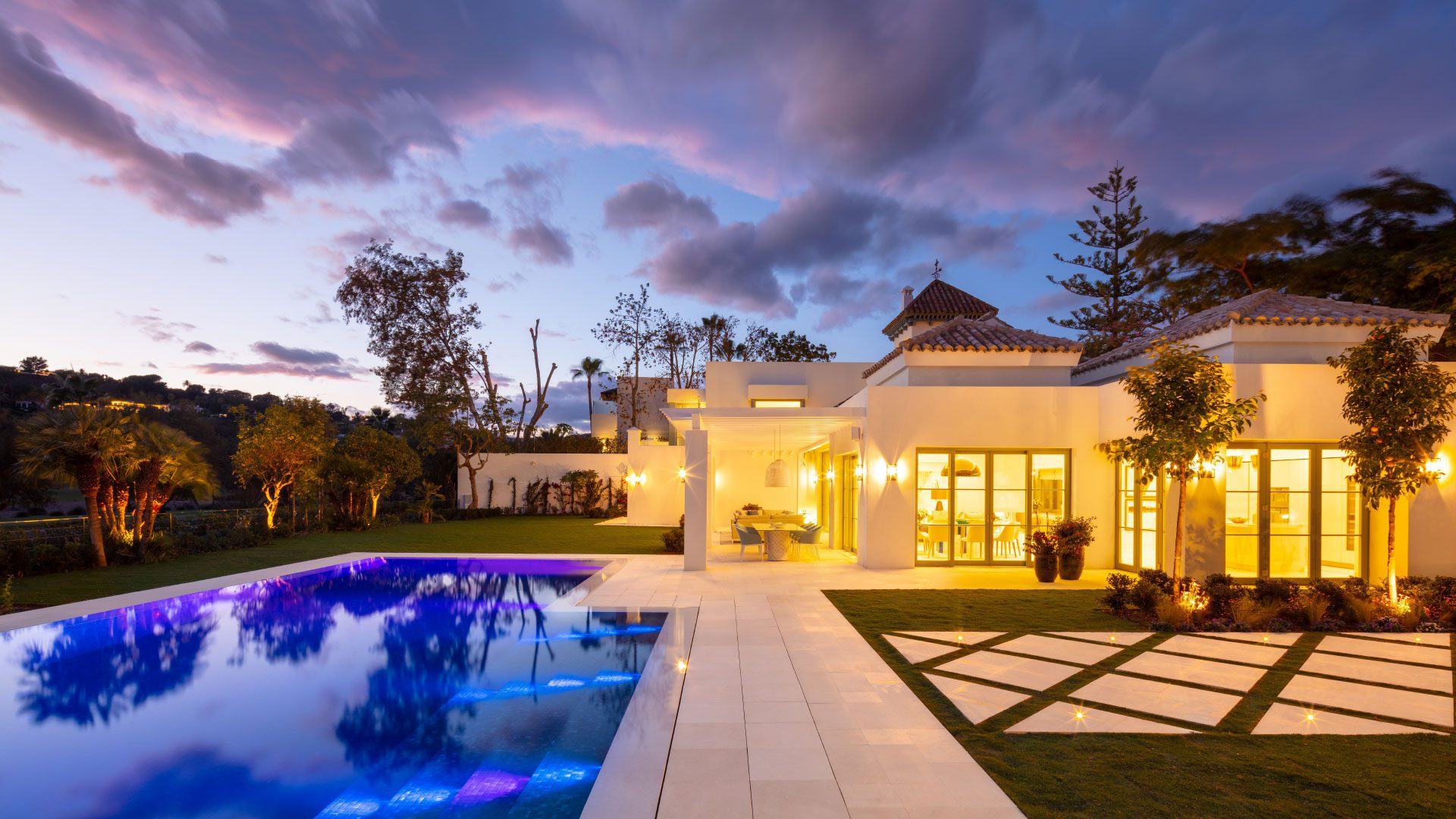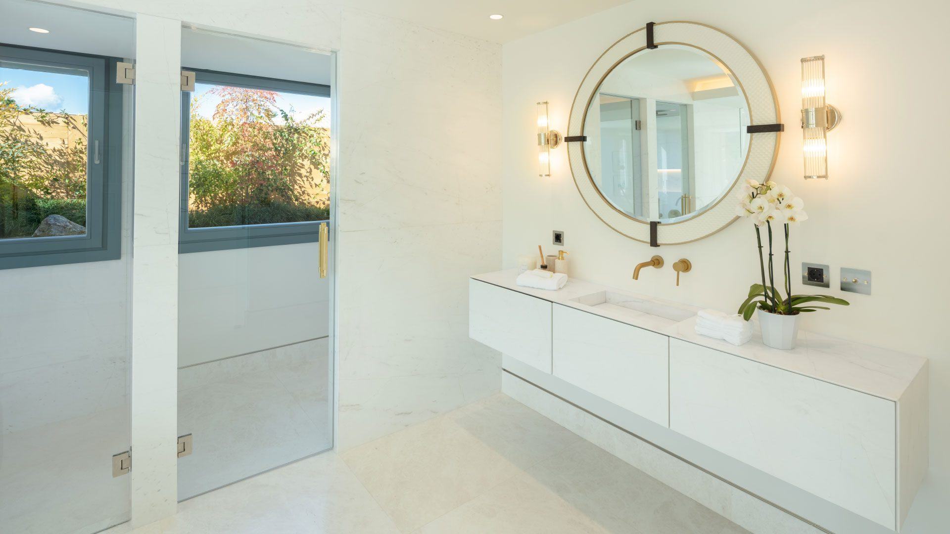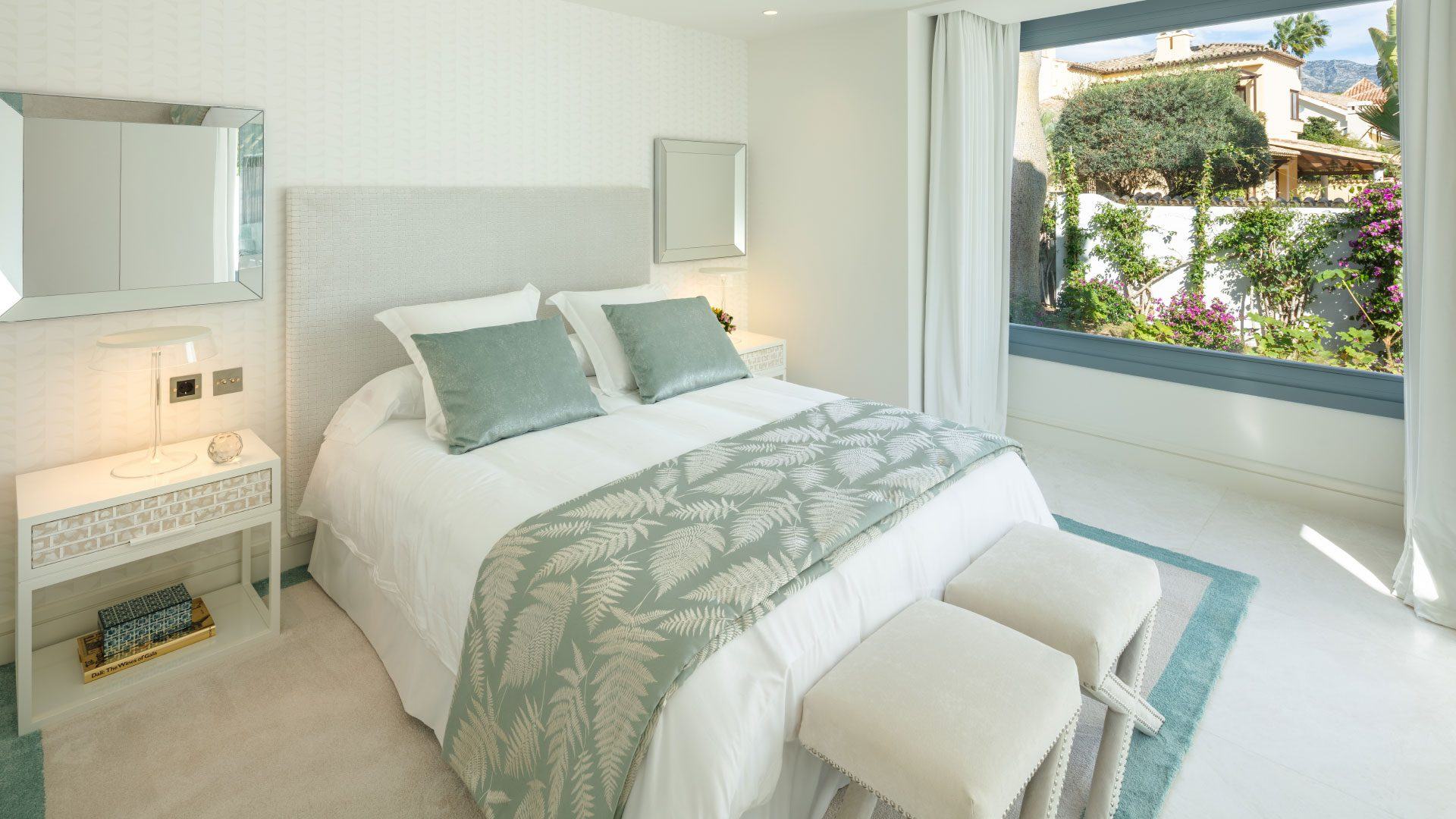 Inside, the property showcases sophisticated interiors designed by Pedro Peña, with soaring ceilings, elegant living spaces, and seamless indoor-outdoor flow. The estate includes a main house and a separate guest house, together providing luxurious accommodation for up to 14 guests. Highlights include a fully equipped gym and yoga studio, multiple kitchens including a chef’s kitchen for private catering, expansive entertaining areas, and serene bedroom suites with spa-style bathrooms. Located in a gated community with 24/7 security just minutes from Puerto Banús, beaches, and world-class golf, the villa delivers the perfect blend of privacy, glamour, and resort-style living.
