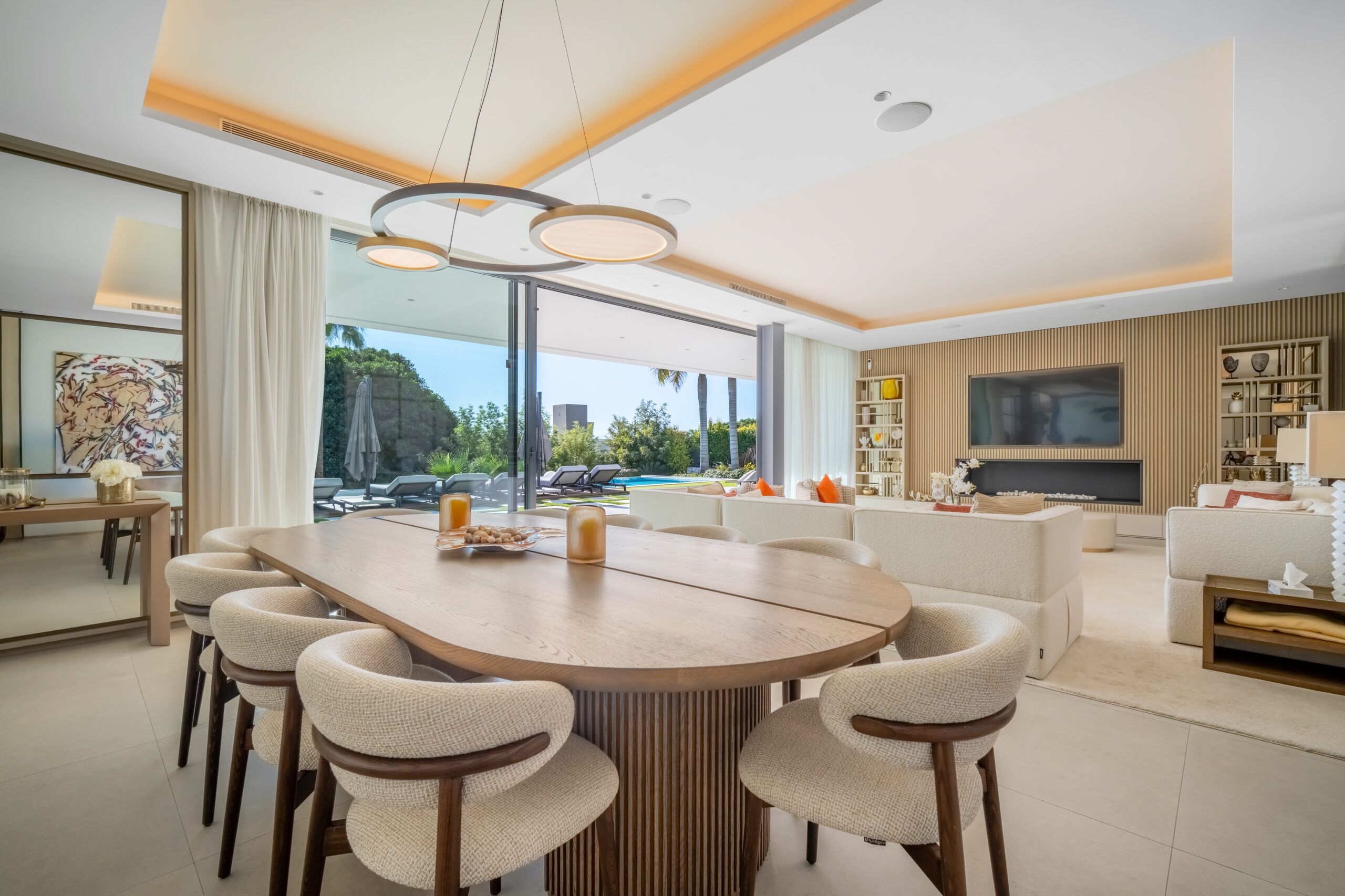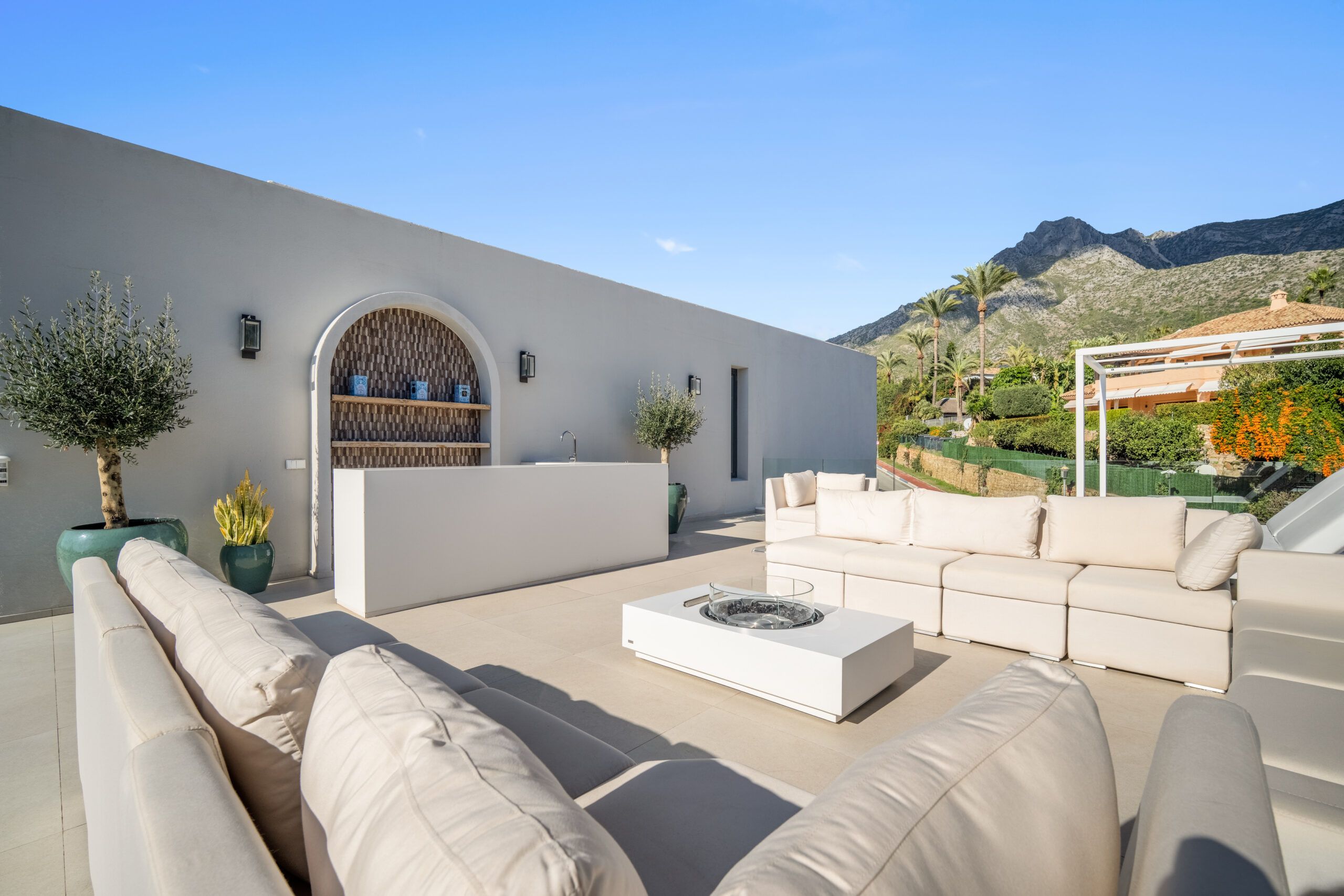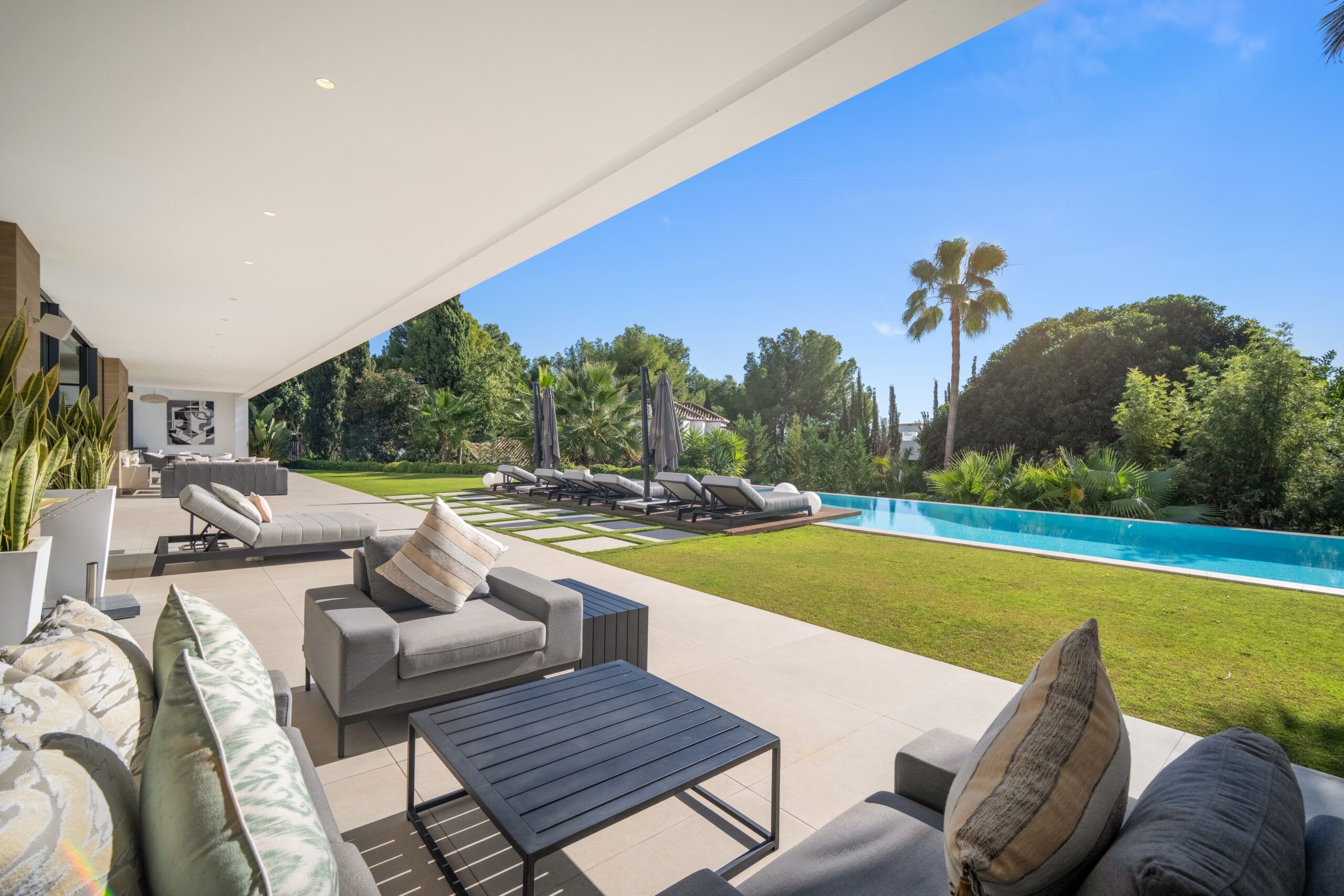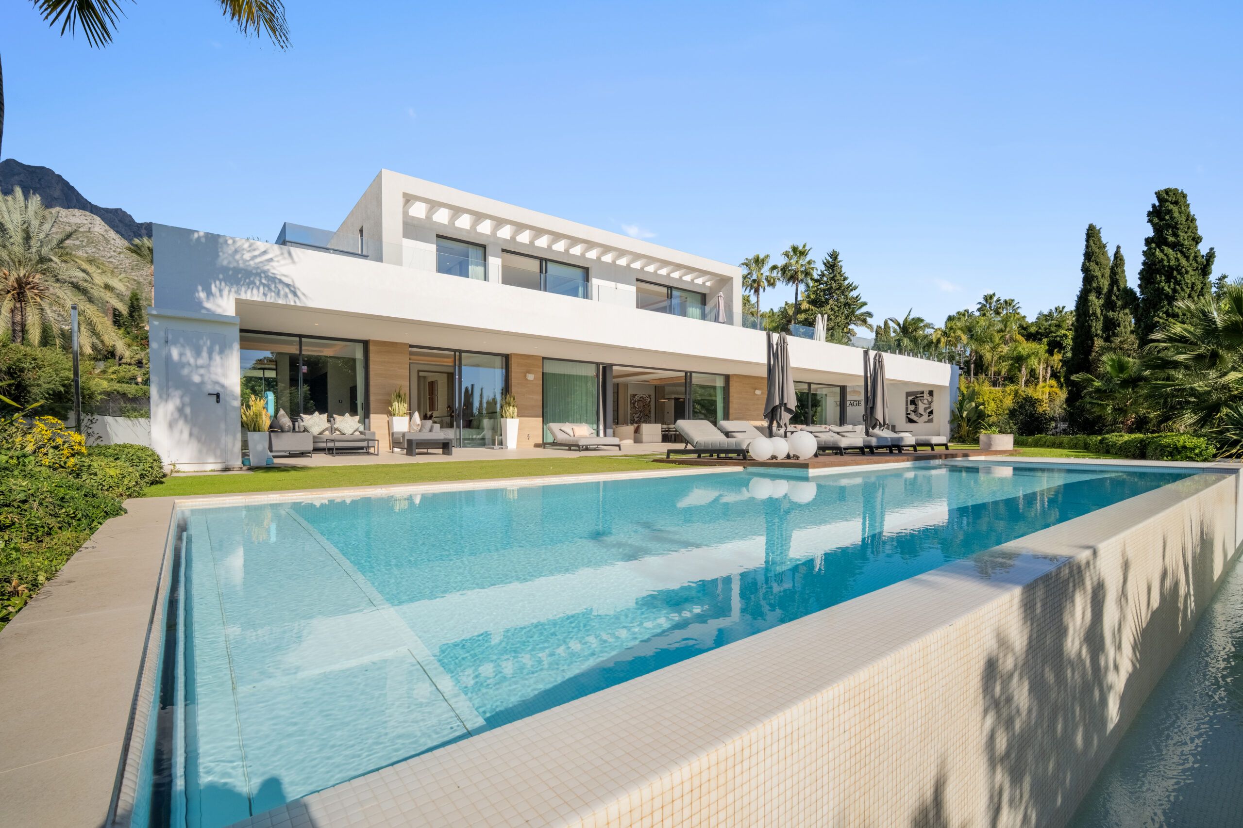 With 8 en-suite bedrooms and multiple spacious living areas, the property comfortably accommodates large groups, making it a perfect choice for family retreats or luxury gatherings. The villa’s thoughtful amenities — including a private sauna and gym, sleek contemporary interiors by AJ Flores, and round-the-clock concierge service — elevate your stay to resort-caliber comfort. Whether you’re lounging by the pool, entertaining on the terrace at sunset, or exploring Marbella’s beaches and nightlife just minutes away, Villa Mirage delivers an unforgettable blend of tranquility, style, and sophistication.