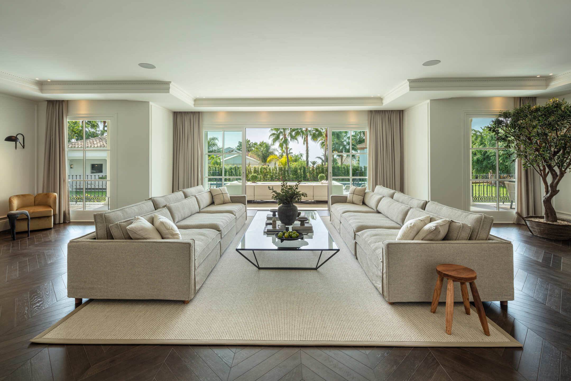 Designed for both relaxation and entertainment, the villa spans three spacious levels and features exceptional leisure amenities including a private gym, sauna, and games room. Guests can unwind beside the lagoon-style swimming pool set within manicured gardens, enjoy sunset drinks overlooking the Mediterranean, or gather inside elegant living areas warmed by a traditional fireplace. With luxurious en-suite bedrooms, expansive terraces, and high-end comforts like underfloor heating and air conditioning throughout, the villa delivers an unparalleled blend of comfort, privacy, and refined Marbella luxury.